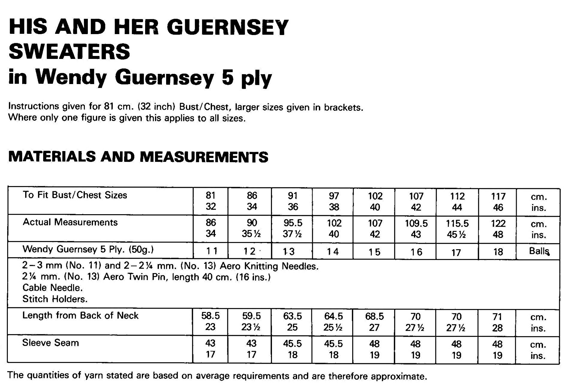 Measurements : to fit ladies or mens 32, 34, 36, 38, 40, 42, 44 and 46 inch chest, instructions given for 8 sizes.
